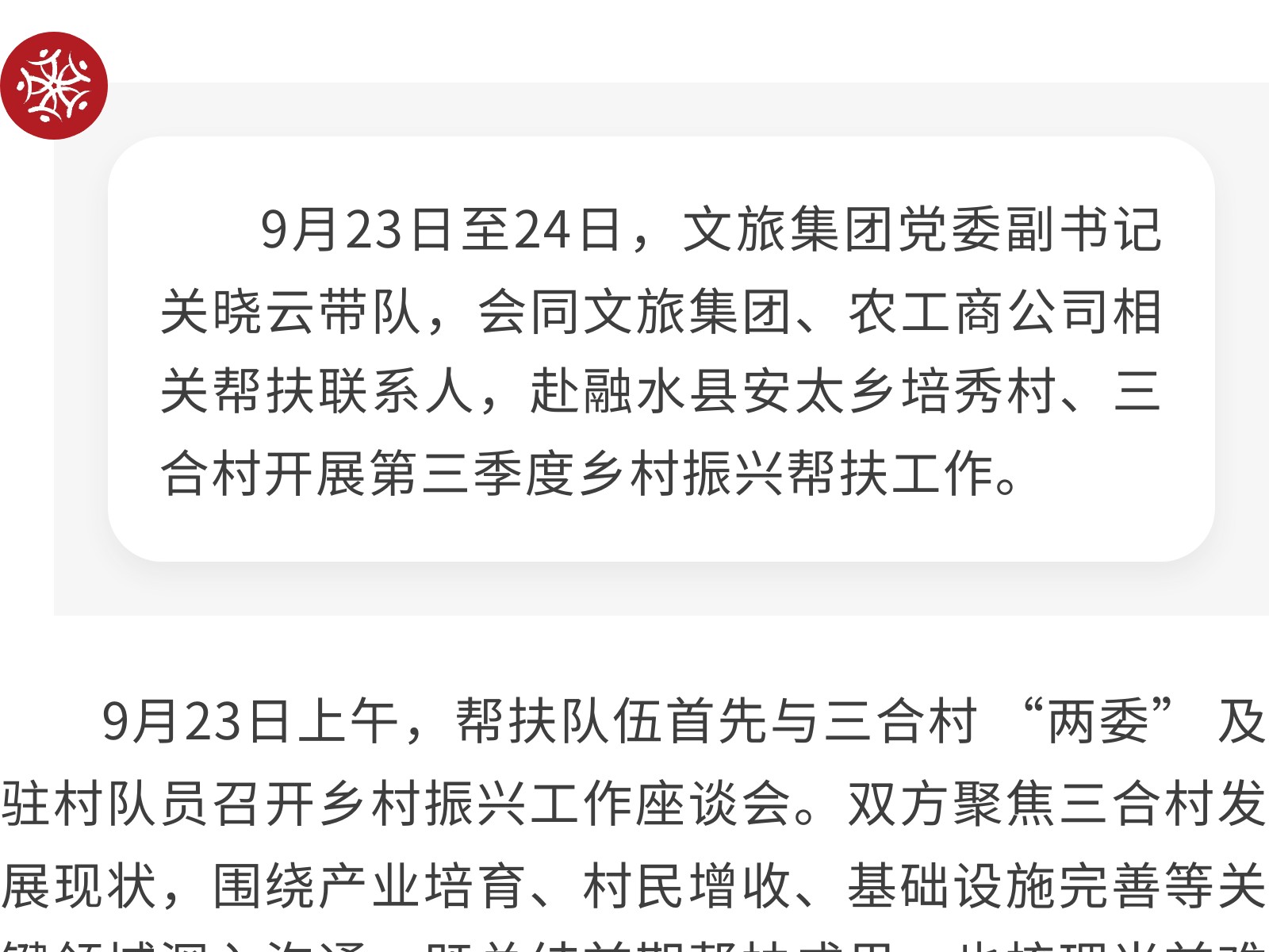 文旅集團開展2025年第三季度鄉(xiāng)村振興幫扶活動 發(fā)布時間:2025年09月30日 16時來源:本站原創(chuàng)瀏覽:19 人次